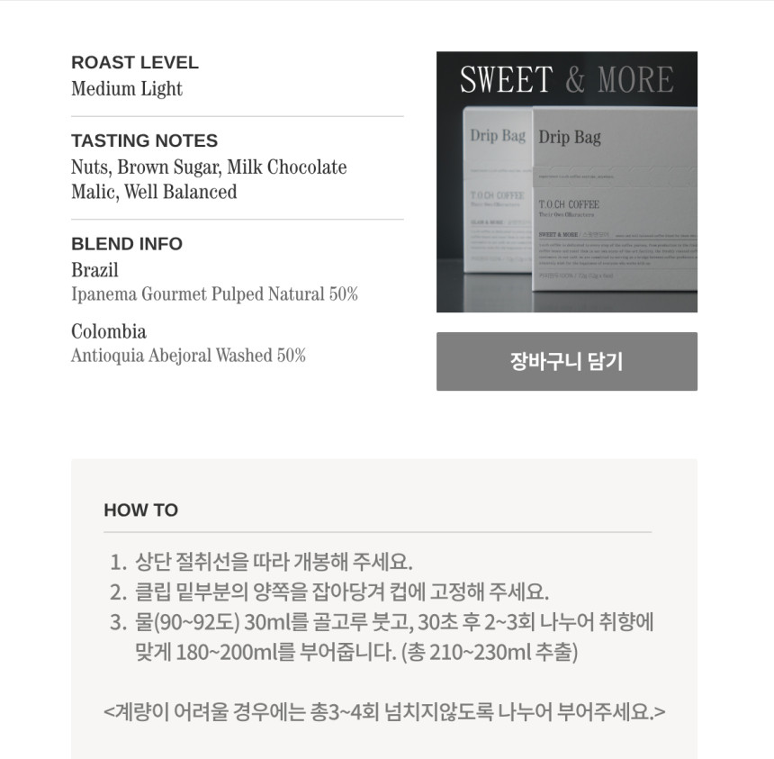 커피: 스윗 앤 모어 블랜드 Sweet & More Blend (브라질30%, 콜롬비아50% )